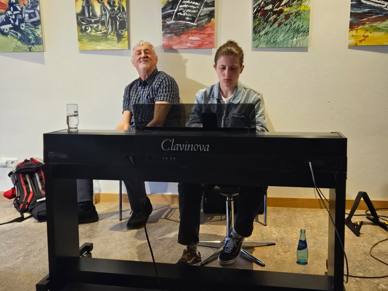 Als schwungvolle Zugabe rundete der Lied-Klassiker von Bertolt Brecht und Kurt Weill über die „Unzulänglichkeit menschlichen Strebens‟ ein anderthalbstündiges Programm ab, das erfreulich viele Interessierte ins Dorfgemeinschaftshaus gelockt hatte. Sie folgten auch gerne der Einladung, nach dem Schlussakkord die Bilder zu betrachten und mit Autor, Künstlerin und Musikanten ins Gespräch zu kommen.