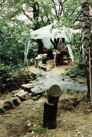 Dass wir dort zu campieren begannen (mit der erklärten Absicht „zu sommern‟), hatte viel mit einem anderen Ort zu tun: Weißenseifen. Eine „Künstlersiedlung‟ am Westrand der Republik, zirka 235 Straßenkilometer von Laubach entfernt. Dort waren einige von uns einander zu Beginn der achtziger Jahre erstmals begegnet; auf einer ausgedehnten Waldlichtung, wo der Bildhauer, Maler und Zeichner Albrecht Klauer-Simonis (1918 – 2002) zum „Symposion Weißenseifen‟ geladen hatte. Regelmäßig im Sommer öffnete er das Gelände bei seinem Atelierhaus für Teilnehmer, die es in der Kunst schon zu etwas gebracht hatten. Willkommen waren aber auch interessierte Laien, die sich auf das dortige Treiben einlassen wollten. Hauptbeschäftigung in den frühen Jahren war die Bildhauerei unter freiem Himmel, ohne maschinelle Erleichterung, mit Hammer und Meißel. Als Werkmaterial diente der in der Gegend reichlich vorhandene Sandstein.